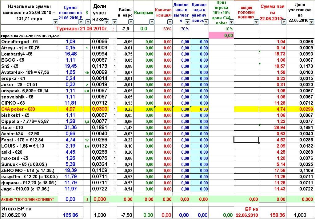 Для тех кто еще не в курсе, организовывается коллективный бэккинг, для игры в хороших турнирах, в целях сплочения рядов, улучшения скилла и наживы денег. Список вкладчиков и суммы (доли) на 21.12.2011г. Порядок расчетов: 1 Взносы участников суммируются и определяется доля каждого по отношению к БР на момент старта турнира (в течение турнира взносы не принимаются) а) Взнос С4А poker учитывается обычном порядке, но вывод средств не допускаеться, а направляеться на увеличение БР копилки (по достижении суммы доли С4А poker е1000 часть, но не больше 30%, может быть использована С4А poker по своему усмотрению). 2 При распределении дивидендов применяются следующие правила: а) Дольщикам выплачивается, согласно долям 30% суммы выигрыша, но не меньше е5 (сумма меньше добавляется к первоначальному взносу (сумме взноса перед турниром-заносом) и увеличивает долю участника при распределении последующих выигрышей) б) 60% идет на капитализацию БР копилки (по достижении суммы в е1000 пропорция может быть пересмотрена в сторону увеличения выплат) в) 10% (и рейкбек) выплачивается игроку или по желанию добавляется во взнос-долю участника. г) Игрок дополнительно премируеться в размере 10% доли С4А poker 3 При уменьшении суммы БР меньше первоначального в 2 раза дивиденды не выплачиваются (кроме 10% игрока) 4 Доля одного пайщика не может превышать 50% от суммы копилки. (в случае превышения производиться автоматическое перечисление денег пайщику. (прим. в случае с С4А poker сумма превышающая порог, распределяется между пайщиками в пропорции равной вкладам на момент превышения) 5 Величина пая не даёт преимущества и привилегий в решении вопросов. 6 При желании выйти из числа пайщиков, участнику выплачивается 100% его доли на момент заявления (заявление не допустимо во время турнира). 7 При переводе денег с использованием платёжных систем, взимающих комиссию за свои услуги соблюдаются следующие правила: а) В случае исполнения обязательных платежей (возмещение игроку затрат собственных средств на БИ, перевод игроком выигрыша в копилку и т.п.) комиссия покрывается денежными средствами копилки. (Например:Fanat при переводе 52е выигрыша, в копилку через вебмани, переводит - €51,59 и платит комиссию €0,41 (комиссия за перевод в ВМ = 0,8%) Пересчёт долей пайщиков в связи с этими потерями, производиться перед выплатой дивидендов или полном расчёте с пайщиком. б) В случае исполнения заявленных платежей (выплата дивидендов, полный расчёт с пайщиком, и т.п.) оплата комиссии производиться за счёт получателя. (Например: Оплата Fanatу приза за занос -7,61 (от которого он отказался, в пользу увеличения своей доли в копилке) если с ВМ: перевожу €7,55 - комиссия €0,06, Fanat получает -€7,55). 8 Сумма по акции "Пополни копилку" зачитываеться так, 50% из выигранной (за минусм БИ) в "благотворительном" турнире суммы идет в увеличение доли игрока, 50% плюсуется, не изменяя величину доли. Рум: С4а Сыграны турниры за ...: Нет Заявки на перевод средств на БИ оставлять не менее чем за 30 минут до начала турнира в ветке. Ссылка для обсуждения: Тема "Коллективный бэккинг Вигориш, предложения путей развития, фан трибуна": /section91/topic6364-80.html Способы связи и просмотра: Бар ----------------------> /bar/ Skype --------------------> Vigorish.ru На данном этапе возможно только через Тимвивер скачать ------------------> http://www.teamviewer.ru Способы внесения денежных средств: E495745385150 Z377663063691 При переводе указывать ник н