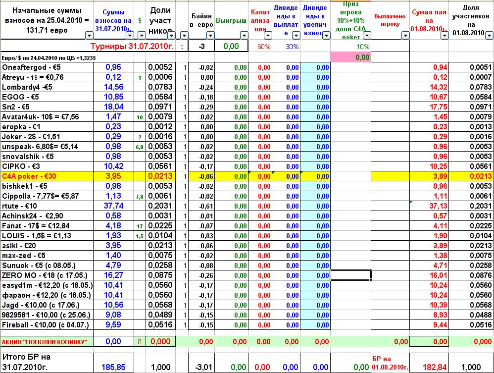 Для тех кто еще не в курсе, организовывается коллективный бэккинг, для игры в хороших турнирах, в целях сплочения рядов, улучшения скилла и наживы денег. Список вкладчиков и суммы (доли) на 21.12.2011г. Порядок расчетов: 1 Взносы участников суммируются и определяется доля каждого по отношению к БР на момент старта турнира (в течение турнира взносы не принимаются) а) Взнос С4А poker учитывается обычном порядке, но вывод средств не допускаеться, а направляеться на увеличение БР копилки (по достижении суммы доли С4А poker е1000 часть, но не больше 30%, может быть использована С4А poker по своему усмотрению). 2 При распределении дивидендов применяются следующие правила: а) Дольщикам выплачивается, согласно долям 30% суммы выигрыша, но не меньше е5 (сумма меньше добавляется к первоначальному взносу (сумме взноса перед турниром-заносом) и увеличивает долю участника при распределении последующих выигрышей) б) 60% идет на капитализацию БР копилки (по достижении суммы в е1000 пропорция может быть пересмотрена в сторону увеличения выплат) в) 10% (и рейкбек) выплачивается игроку или по желанию добавляется во взнос-долю участника. г) Игрок дополнительно премируеться в размере 10% доли С4А poker 3 При уменьшении суммы БР меньше первоначального в 2 раза дивиденды не выплачиваются (кроме 10% игрока) 4 Доля одного пайщика не может превышать 50% от суммы копилки. (в случае превышения производиться автоматическое перечисление денег пайщику. (прим. в случае с С4А poker сумма превышающая порог, распределяется между пайщиками в пропорции равной вкладам на момент превышения) 5 Величина пая не даёт преимущества и привилегий в решении вопросов. 6 При желании выйти из числа пайщиков, участнику выплачивается 100% его доли на момент заявления (заявление не допустимо во время турнира). 7 При переводе денег с использованием платёжных систем, взимающих комиссию за свои услуги соблюдаются следующие правила: а) В случае исполнения обязательных платежей (возмещение игроку затрат собственных средств на БИ, перевод игроком выигрыша в копилку и т.п.) комиссия покрывается денежными средствами копилки. (Например:Fanat при переводе 52е выигрыша, в копилку через вебмани, переводит - €51,59 и платит комиссию €0,41 (комиссия за перевод в ВМ = 0,8%) Пересчёт долей пайщиков в связи с этими потерями, производиться перед выплатой дивидендов или полном расчёте с пайщиком. б) В случае исполнения заявленных платежей (выплата дивидендов, полный расчёт с пайщиком, и т.п.) оплата комиссии производиться за счёт получателя. (Например: Оплата Fanatу приза за занос -7,61 (от которого он отказался, в пользу увеличения своей доли в копилке) если с ВМ: перевожу €7,55 - комиссия €0,06, Fanat получает -€7,55). 8 Сумма по акции "Пополни копилку" зачитываеться так, 50% из выигранной (за минусм БИ) в "благотворительном" турнире суммы идет в увеличение доли игрока, 50% плюсуется, не изменяя величину доли. Рум: С4а Сыграны турниры за ...: Нет Заявки на перевод средств на БИ оставлять не менее чем за 30 минут до начала турнира в ветке. Ссылка для обсуждения: Тема "Коллективный бэккинг Вигориш, предложения путей развития, фан трибуна": /section91/topic6364-80.html Способы связи и просмотра: Бар ----------------------> /bar/ Skype --------------------> Vigorish.ru На данном этапе возможно только через Тимвивер скачать ------------------> http://www.teamviewer.ru Способы внесения денежных средств: E495745385150 Z377663063691 При переводе указывать ник н