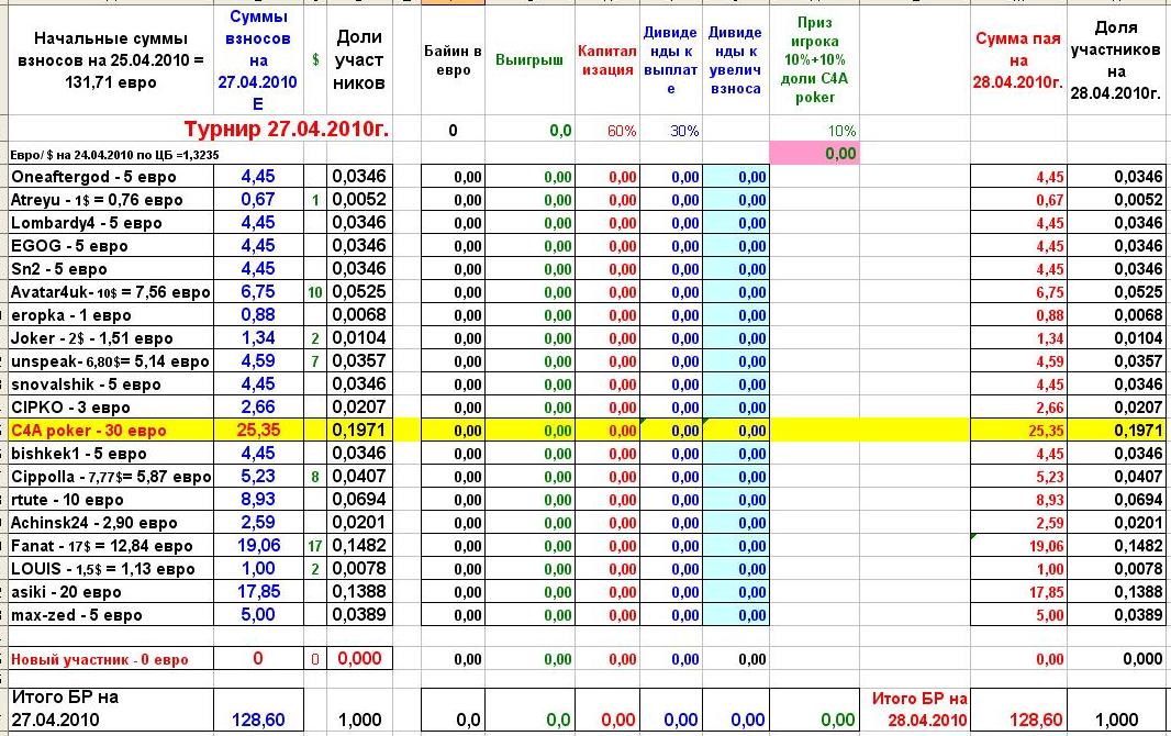 Для тех кто еще не в курсе, организовывается коллективный бэккинг, для игры в хороших турнирах, в целях сплочения рядов, улучшения скилла и наживы денег. Список вкладчиков и суммы (доли) на 21.12.2011г. Порядок расчетов: 1 Взносы участников суммируются и определяется доля каждого по отношению к БР на момент старта турнира (в течение турнира взносы не принимаются) а) Взнос С4А poker учитывается обычном порядке, но вывод средств не допускаеться, а направляеться на увеличение БР копилки (по достижении суммы доли С4А poker е1000 часть, но не больше 30%, может быть использована С4А poker по своему усмотрению). 2 При распределении дивидендов применяются следующие правила: а) Дольщикам выплачивается, согласно долям 30% суммы выигрыша, но не меньше е5 (сумма меньше добавляется к первоначальному взносу (сумме взноса перед турниром-заносом) и увеличивает долю участника при распределении последующих выигрышей) б) 60% идет на капитализацию БР копилки (по достижении суммы в е1000 пропорция может быть пересмотрена в сторону увеличения выплат) в) 10% (и рейкбек) выплачивается игроку или по желанию добавляется во взнос-долю участника. г) Игрок дополнительно премируеться в размере 10% доли С4А poker 3 При уменьшении суммы БР меньше первоначального в 2 раза дивиденды не выплачиваются (кроме 10% игрока) 4 Доля одного пайщика не может превышать 50% от суммы копилки. (в случае превышения производиться автоматическое перечисление денег пайщику. (прим. в случае с С4А poker сумма превышающая порог, распределяется между пайщиками в пропорции равной вкладам на момент превышения) 5 Величина пая не даёт преимущества и привилегий в решении вопросов. 6 При желании выйти из числа пайщиков, участнику выплачивается 100% его доли на момент заявления (заявление не допустимо во время турнира). 7 При переводе денег с использованием платёжных систем, взимающих комиссию за свои услуги соблюдаются следующие правила: а) В случае исполнения обязательных платежей (возмещение игроку затрат собственных средств на БИ, перевод игроком выигрыша в копилку и т.п.) комиссия покрывается денежными средствами копилки. (Например:Fanat при переводе 52е выигрыша, в копилку через вебмани, переводит - €51,59 и платит комиссию €0,41 (комиссия за перевод в ВМ = 0,8%) Пересчёт долей пайщиков в связи с этими потерями, производиться перед выплатой дивидендов или полном расчёте с пайщиком. б) В случае исполнения заявленных платежей (выплата дивидендов, полный расчёт с пайщиком, и т.п.) оплата комиссии производиться за счёт получателя. (Например: Оплата Fanatу приза за занос -7,61 (от которого он отказался, в пользу увеличения своей доли в копилке) если с ВМ: перевожу €7,55 - комиссия €0,06, Fanat получает -€7,55). 8 Сумма по акции "Пополни копилку" зачитываеться так, 50% из выигранной (за минусм БИ) в "благотворительном" турнире суммы идет в увеличение доли игрока, 50% плюсуется, не изменяя величину доли. Рум: С4а Сыграны турниры за ...: Нет Заявки на перевод средств на БИ оставлять не менее чем за 30 минут до начала турнира в ветке. Ссылка для обсуждения: Тема "Коллективный бэккинг Вигориш, предложения путей развития, фан трибуна": /section91/topic6364-80.html Способы связи и просмотра: Бар ----------------------> /bar/ Skype --------------------> Vigorish.ru На данном этапе возможно только через Тимвивер скачать ------------------> http://www.teamviewer.ru Способы внесения денежных средств: E495745385150 Z377663063691 При переводе указывать ник н