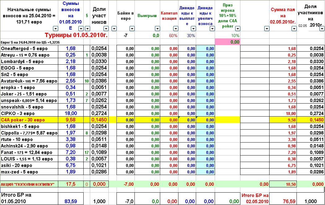 Для тех кто еще не в курсе, организовывается коллективный бэккинг, для игры в хороших турнирах, в целях сплочения рядов, улучшения скилла и наживы денег. Список вкладчиков и суммы (доли) на 21.12.2011г. Порядок расчетов: 1 Взносы участников суммируются и определяется доля каждого по отношению к БР на момент старта турнира (в течение турнира взносы не принимаются) а) Взнос С4А poker учитывается обычном порядке, но вывод средств не допускаеться, а направляеться на увеличение БР копилки (по достижении суммы доли С4А poker е1000 часть, но не больше 30%, может быть использована С4А poker по своему усмотрению). 2 При распределении дивидендов применяются следующие правила: а) Дольщикам выплачивается, согласно долям 30% суммы выигрыша, но не меньше е5 (сумма меньше добавляется к первоначальному взносу (сумме взноса перед турниром-заносом) и увеличивает долю участника при распределении последующих выигрышей) б) 60% идет на капитализацию БР копилки (по достижении суммы в е1000 пропорция может быть пересмотрена в сторону увеличения выплат) в) 10% (и рейкбек) выплачивается игроку или по желанию добавляется во взнос-долю участника. г) Игрок дополнительно премируеться в размере 10% доли С4А poker 3 При уменьшении суммы БР меньше первоначального в 2 раза дивиденды не выплачиваются (кроме 10% игрока) 4 Доля одного пайщика не может превышать 50% от суммы копилки. (в случае превышения производиться автоматическое перечисление денег пайщику. (прим. в случае с С4А poker сумма превышающая порог, распределяется между пайщиками в пропорции равной вкладам на момент превышения) 5 Величина пая не даёт преимущества и привилегий в решении вопросов. 6 При желании выйти из числа пайщиков, участнику выплачивается 100% его доли на момент заявления (заявление не допустимо во время турнира). 7 При переводе денег с использованием платёжных систем, взимающих комиссию за свои услуги соблюдаются следующие правила: а) В случае исполнения обязательных платежей (возмещение игроку затрат собственных средств на БИ, перевод игроком выигрыша в копилку и т.п.) комиссия покрывается денежными средствами копилки. (Например:Fanat при переводе 52е выигрыша, в копилку через вебмани, переводит - €51,59 и платит комиссию €0,41 (комиссия за перевод в ВМ = 0,8%) Пересчёт долей пайщиков в связи с этими потерями, производиться перед выплатой дивидендов или полном расчёте с пайщиком. б) В случае исполнения заявленных платежей (выплата дивидендов, полный расчёт с пайщиком, и т.п.) оплата комиссии производиться за счёт получателя. (Например: Оплата Fanatу приза за занос -7,61 (от которого он отказался, в пользу увеличения своей доли в копилке) если с ВМ: перевожу €7,55 - комиссия €0,06, Fanat получает -€7,55). 8 Сумма по акции "Пополни копилку" зачитываеться так, 50% из выигранной (за минусм БИ) в "благотворительном" турнире суммы идет в увеличение доли игрока, 50% плюсуется, не изменяя величину доли. Рум: С4а Сыграны турниры за ...: Нет Заявки на перевод средств на БИ оставлять не менее чем за 30 минут до начала турнира в ветке. Ссылка для обсуждения: Тема "Коллективный бэккинг Вигориш, предложения путей развития, фан трибуна": /section91/topic6364-80.html Способы связи и просмотра: Бар ----------------------> /bar/ Skype --------------------> Vigorish.ru На данном этапе возможно только через Тимвивер скачать ------------------> http://www.teamviewer.ru Способы внесения денежных средств: E495745385150 Z377663063691 При переводе указывать ник н