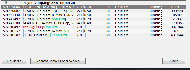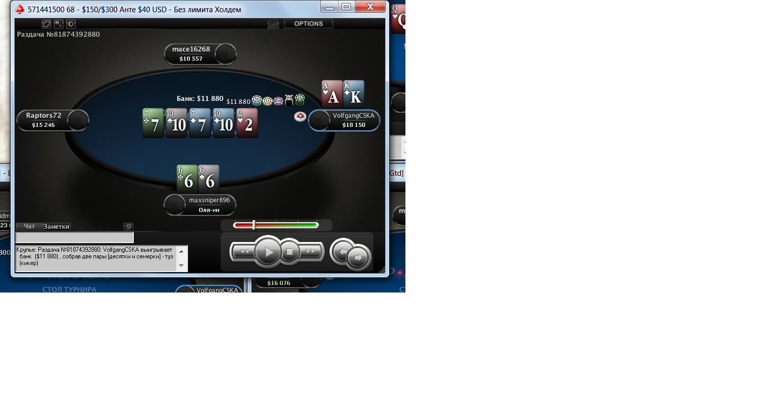 В кое-то веки у меня выдался свободный вечер и я хочу посвятить его плотной МТТ-шной катке. В виду острой необходимости пришлось вывести половину БР. Собственно говоря ровно половину от БИ хотелось бы и продать. Всю информацию обо мне моно найти в моем заброшенном дневнике - /blogs/blog7172 ,там же в шапке топика имеются статы по МТТ и не только. Скажу только что МТТ не играл довольно долго - с головой ушел в ПЛ Холдем ХА СНГ,так что доли будете покупать на свой собственный страх и риск. Собственно говоря турниры: -время везде московское- 22-00 - 3.30$ NL Holdem[5k Gtd] 22-00 - The Big 11$[75K Gtd.] 22-15 - 1.10$+R NL Holdem [3-x Turbo,60K Gtd.] Закладываю 5Р+1А = 7,10$ 22-15 - 4,40$ NL Holdem [8-max,1000 CAP,2K Gtd.] 22-30 - 3.30$+R NL Holdem[20K Gtd.] Закладываю 1Р+1А = 9,30$ 22-30 - 2.20$ NL Holdem [6-max, 3K Gtd] 23-30 - 11$ NL Holdem [12.5K Gtd] 23-45 - 5.50$ NL Holdem [1000 CAP, 3K Gtd.] 00-10 - 2.20$ Mixed PL Holdem/ PL Omaha 00-15 - 2.20$ NL Holdem [5K Gtd] 00-15 - 4.40$ NLHE [4-max, 1000 CAP, 2.5K Gtd.] 00-35 - 1.10$ PL Omaha H/L [500$ Gtd.] Суммарный БИ: 63,70$ От себя вношу 50% = 31,85$ В продаже оставшиеся 31,85$ Мин Доля 25%= 7,97$ Профит(если таковой будет иметься) поделим пополам,при заносе более 1000$ мой откат 20% от доли дольщиков. Если интерес есть то отписывайтесь здесь и потом кидайте переводом в ПС на ник VolfgangCSKA Всем приятного вечера ![]() 50% Продано Саше "No Pair" Последний раз редактировалось VolfgangCSKA 16 июн 2012, 13:19, всего редактировалось 3 раз(а).
