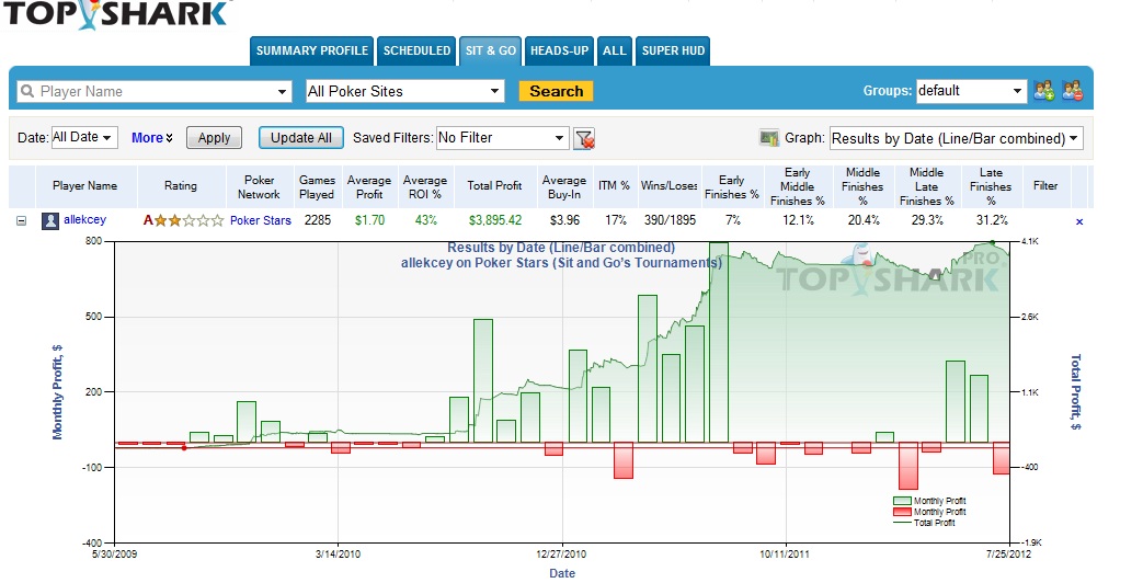 Ник на покер старс (основное место игры): allekcey Статистика открыта Статистика из Топ шарка: Почему-то немного врет, на самом деле общий профит меньше - пордяка 3-4 тысяч. Статистика с бесплатного шаркскопа: Она сильно искажена так как шарскоп "криво" считает ребаи (если играешь ребайник, то он считает твой бай-ин в нем как средний бай-ин в турнире, значит если даже не делался ребай, а остальные игроки сделали по несколько ребаев, то за бай-ин будет посчитан средний ребай в турнире, и как следствие бай-ин по статистике шарскопа будет завышен по сравнению с реальным). На самом деле общий профит где-то около $3 000 Если без ребайников, то статистика выглядит так: В ребайниках делаю обычно 1R+1A, часто аддон не делаю (т.к. нет необходимости если стек и так хороший или нет смысла если стек очень маленький). Очень редко делаю дополнительный дабл ребай если проиграл стек, а стол очень сладкий, но только если это по банкролу. Поэтому и такое большое несовпадение между данными шаркскопа и реальностью. Более подробно обо мне можно почитать в моем дневнике: /blogs/blog4361/ Предыдущие продажи долей: /section91/topic9508.html /section91/topic9510.html Список турниров: 16:30 $22 NL Hold'em Deep Stacks 17:30 $16.50 NLHE 8-max, 1000 Cap, $3K Gtd 18:00 $27 Saturday Eliminator NLHE, Knockout, $50K Gtd, Bounty $5 18:30 $8.8+R NL Hold'em $17.5K Gtd - закладываю $24.8 - 1R+1A 18:45 $21 NL Hold'em Knockout, $2K Gtd, Bounty $10 18:45 $11 NL Hold'em $3K Gtd 19:00 The Big $8.8 $25K Gtd 19:30 $13.5 NL Hold'em Knockout, $5K Gtd, Bounty $2.5 19:30 $8.8 NL Hold'em 1R1A, $9K Gtd - закладываю $24.8 - 1R+1A 20:00 The Big $22 $50K Gtd 20:15 $11 NL Hold'em 1R1A, $5K Gtd - закладываю $31 - 1R+1A 20:15 $8.8 NL Hold'em 500Cap, $3K Gtd 21:00 $22 NL Hold'em $12K Gtd MSNG на 180 человек за 11$ которую сыграю в тот же день ближе к вечеру * время московское ** Синим цветом отмечены турниры с наградой за выбивание - нокауты или баунти *** если будет одновременно набираться больше 6 турниров, некоторые следующие в списке турниры по своему усмотрению могу пропустить (тогда неиспользованные БИ идут в общий профит) Итого бай-инов: $264,2 Продам 30%. Ни откатов, ни коэффициентов нет. Минимальная доля 1%: 2.65$. Доли для удобства счета округлил до сотых(в большую сторону),при выплатах также,чтоб не путаться в копейках - округляю до сотых. Баунти и неиспользованные ребаи(аддоны) и неиспользованные бай-ины идут в профит Оплату приму на: