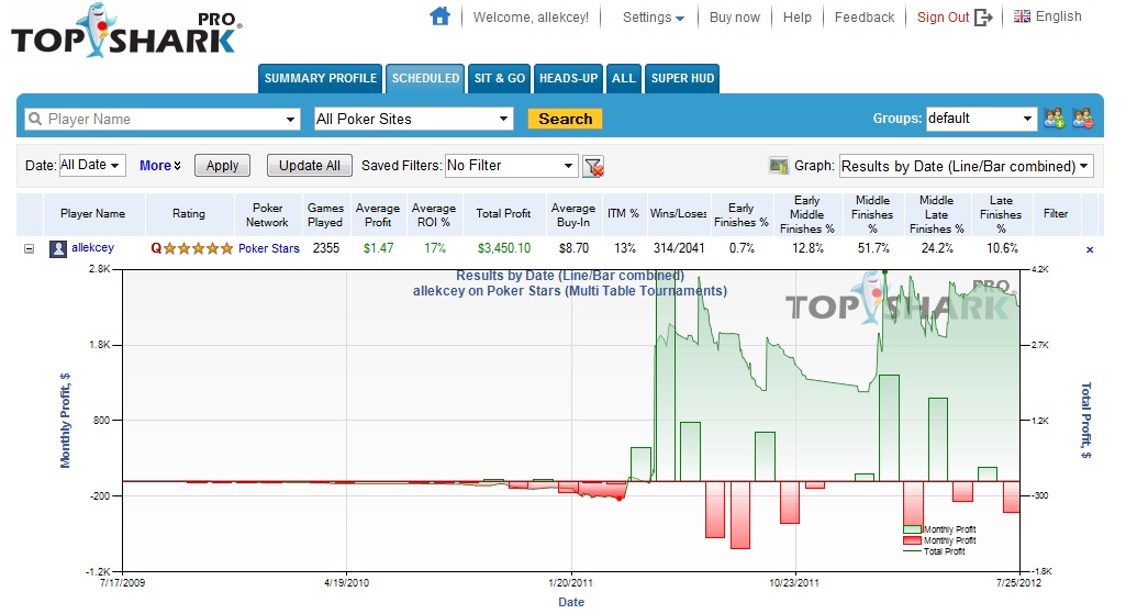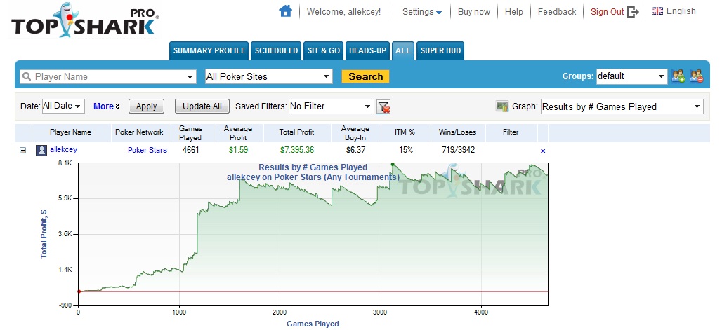 Ник на покер старс (основное место игры): allekcey Статистика открыта Статистика из Топ шарка: Почему-то немного врет, на самом деле общий профит меньше - порядка 3-4 тысяч. Вот статистика с бесплатного шаркскопа: Она сильно искажена так как шарскоп "криво" считает ребаи (если играешь ребайник, то он считает твой бай-ин в нем как средний бай-ин в турнире, значит если даже не делался ребай, а остальные игроки сделали по несколько ребаев, то за бай-ин будет посчитан средний ребай в турнире, и как следствие бай-ин по статистике шарскопа будет завышен по сравнению с реальным). На самом деле общий профит где-то около $3 000 Если без ребайников, то статистика выглядит так: В ребайниках делаю обычно 1R+1A, часто аддон не делаю (т.к. нет необходимости если стек и так хороший или нет смысла если стек очень маленький). Очень редко делаю дополнительный дабл ребай если проиграл стек, а стол очень сладкий, но только если это по банкролу. Поэтому и такое большое несовпадение между данными шаркскопа и реальностью. Более подробно обо мне можно почитать в моем дневнике: /blogs/blog4361/ Предыдущие продажи долей: /section91/topic9508.html /section91/topic9510.html Список турниров: 16:30 $22 NL Hold'em Deep Stacks 17:30 $16.50 NLHE 8-max, 1000 Cap, $3K Gtd 18:30 $8.8+R NL Hold'em $17.5K Gtd - закладываю $24.8 - 1R+1A 18:45 $21 NL Hold'em Knockout, $2K Gtd, Bounty $10 18:45 $11 NL Hold'em $3K Gtd 19:00 The Big $8.8 $25K Gtd 19:30 $13.5 NL Hold'em Knockout, $5K Gtd, Bounty $2.5 19:30 $8.8 NL Hold'em 1R1A, $9K Gtd - закладываю $24.8 - 1R+1A 20:00 The Big $22 $50K Gtd 20:15 $11 NL Hold'em 1R1A, $5K Gtd - закладываю $31 - 1R+1A 20:15 $8.8 NL Hold'em 500Cap, $3K Gtd 21:00 $22 NL Hold'em $12K Gtd MSNG на 180 человек за 11$ которую сыграю в тот же день ближе к вечеру * время московское ** Синим цветом отмечены турниры с наградой за выбивание - нокауты или баунти *** если будет одновременно набираться больше 6 турниров, некоторые следующие в списке турниры по своему усмотрению могу пропустить (тогда неиспользованные БИ идут в общий профит) Итого бай-инов: $237,2 Продам 30%. Ни откатов,sergik ни коэффициентов нет. Минимальная доля 1%: 2.38$. Доли для удобства счета округлил до сотых(в большую сторону),при выплатах также,чтоб не путаться в копейках - округляю до сотых. Баунти и неиспользованные ребаи(аддоны) и неиспользованные бай-ины идут в профит Оплату приму на: